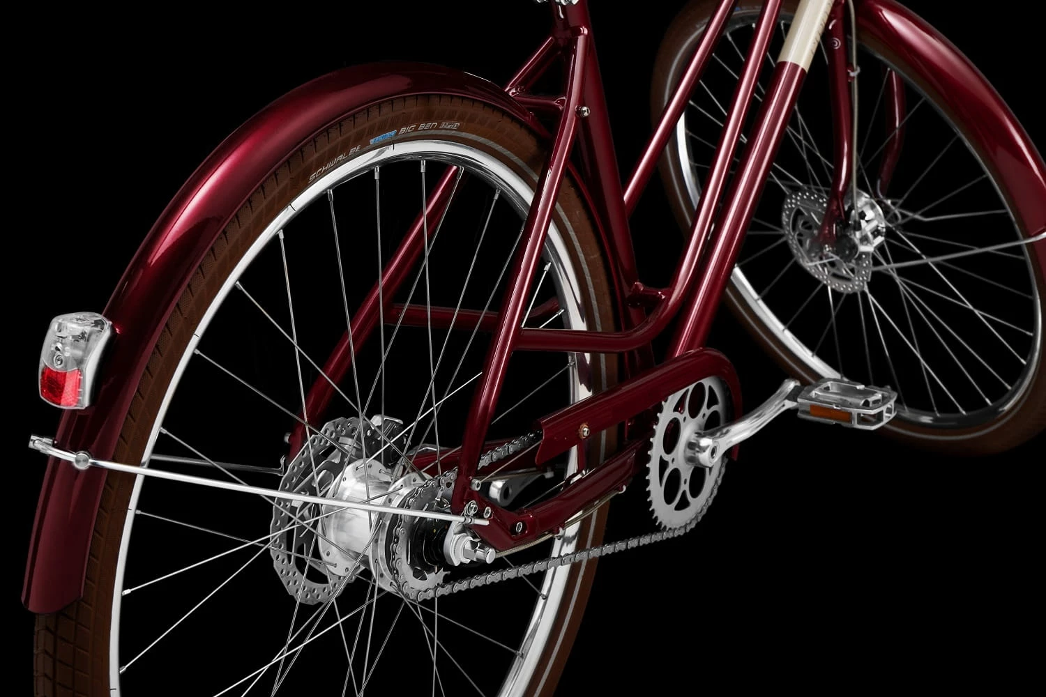 Adaptée, stylée, sexy. Avec ses lignes fines et élégantes et son équipement de qualité, l’Eve attire tous les regards. Vélo de ville léger et moderne, il est le compagnon idéal pour les balades quotidiennes en ville, mais fait également bonne figure lors des excursions plus longues. L’Eve 7 avec entraînement par chaîne convainc par son cadre en aluminium à enjambement bas, ses pneus volumineux pour un confort supplémentaire et ses freins à disque mécaniques sur lesquels on peut compter, quelles que soient les conditions météorologiques. En outre, l’Eve 7 est équipé d’une vitesse au moyeu Shimano Nexus à 7 vitesses et d’un éclairage à dynamo conforme au STVZO.