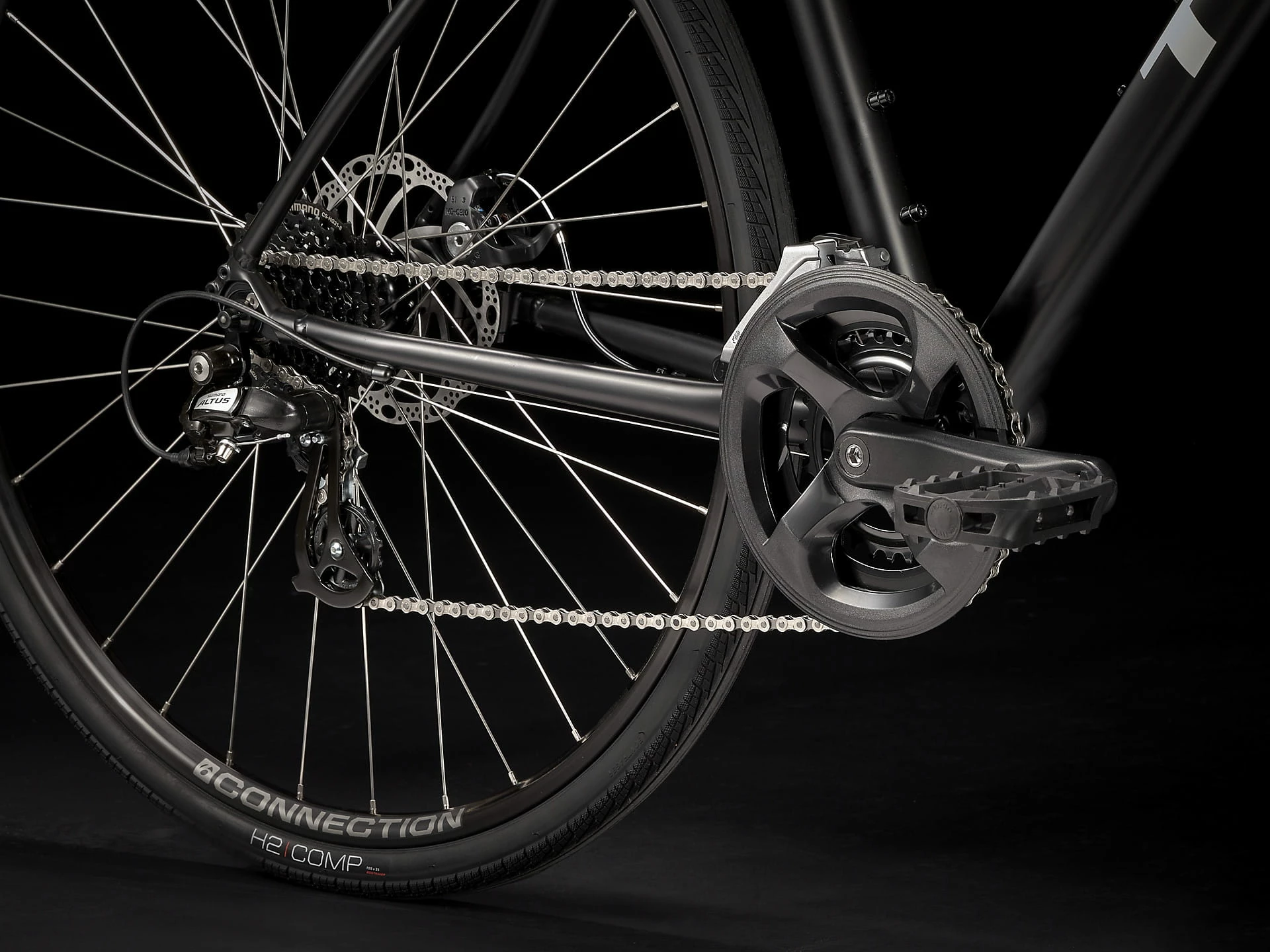 Pneus: Bontrager H2 Comp, tringle à fils, 30 TPI, 700 x 35CMax. Taille des pneus: 38C sans garde-boue, 35C avec garde-boue