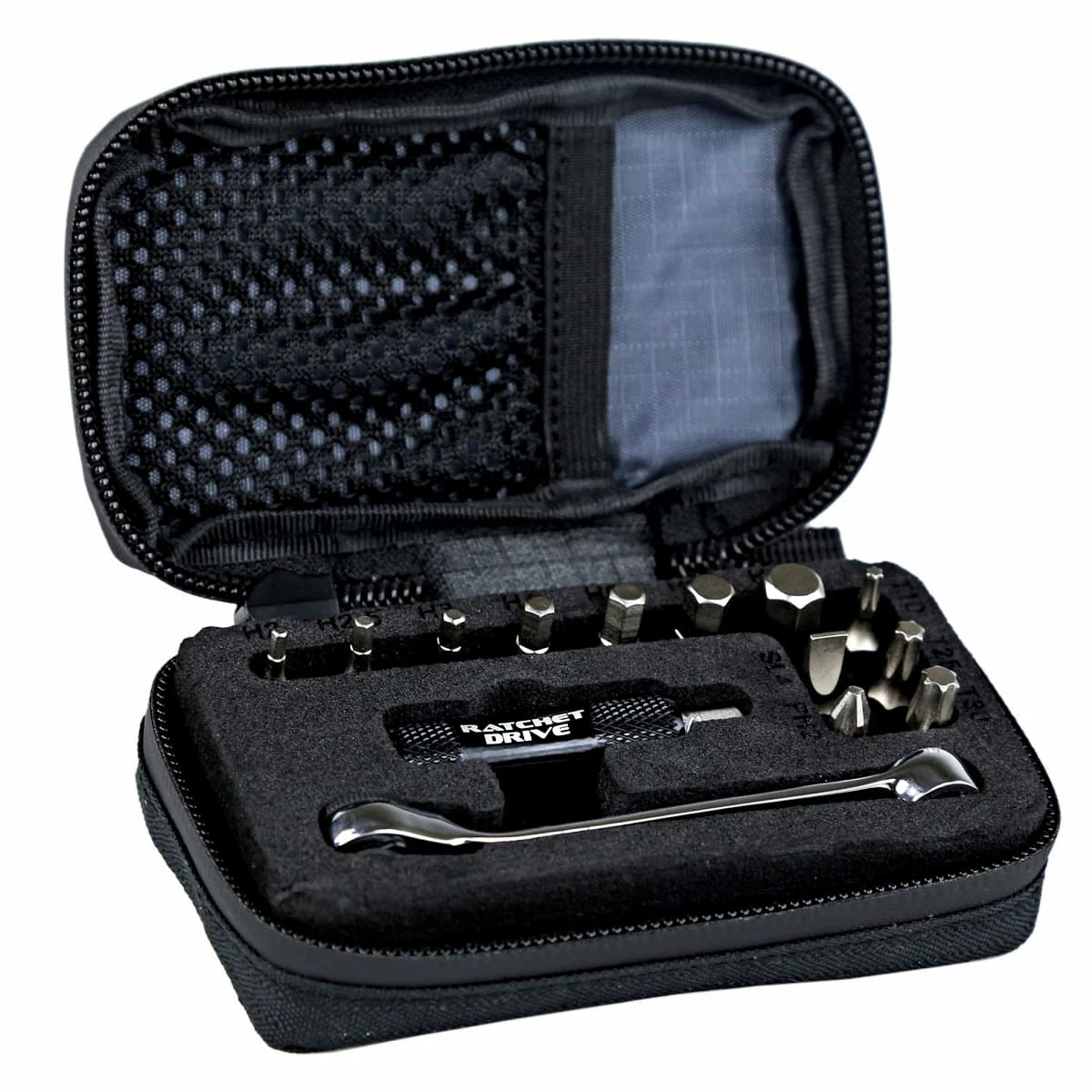 Durable et compact, cet outil à cliquet chromé pour les vélos. Cliquet à dents fines avec manivelle et ouverture fixe à l’extrémité opposée. Sélection d’outils optimisée pour les vélos de route, de gravier et de montagne. Mèches CRV (chrome vanadium) super dures. Adaptateur d’extension en aluminium usiné spécifique à l’application, avec logo gravé au laser. Un aimant intégré permet de maintenir les embouts d’outils en place. Le jeu de cliquets est livré dans une mallette de transport compacte à coque souple, qui est incluse.