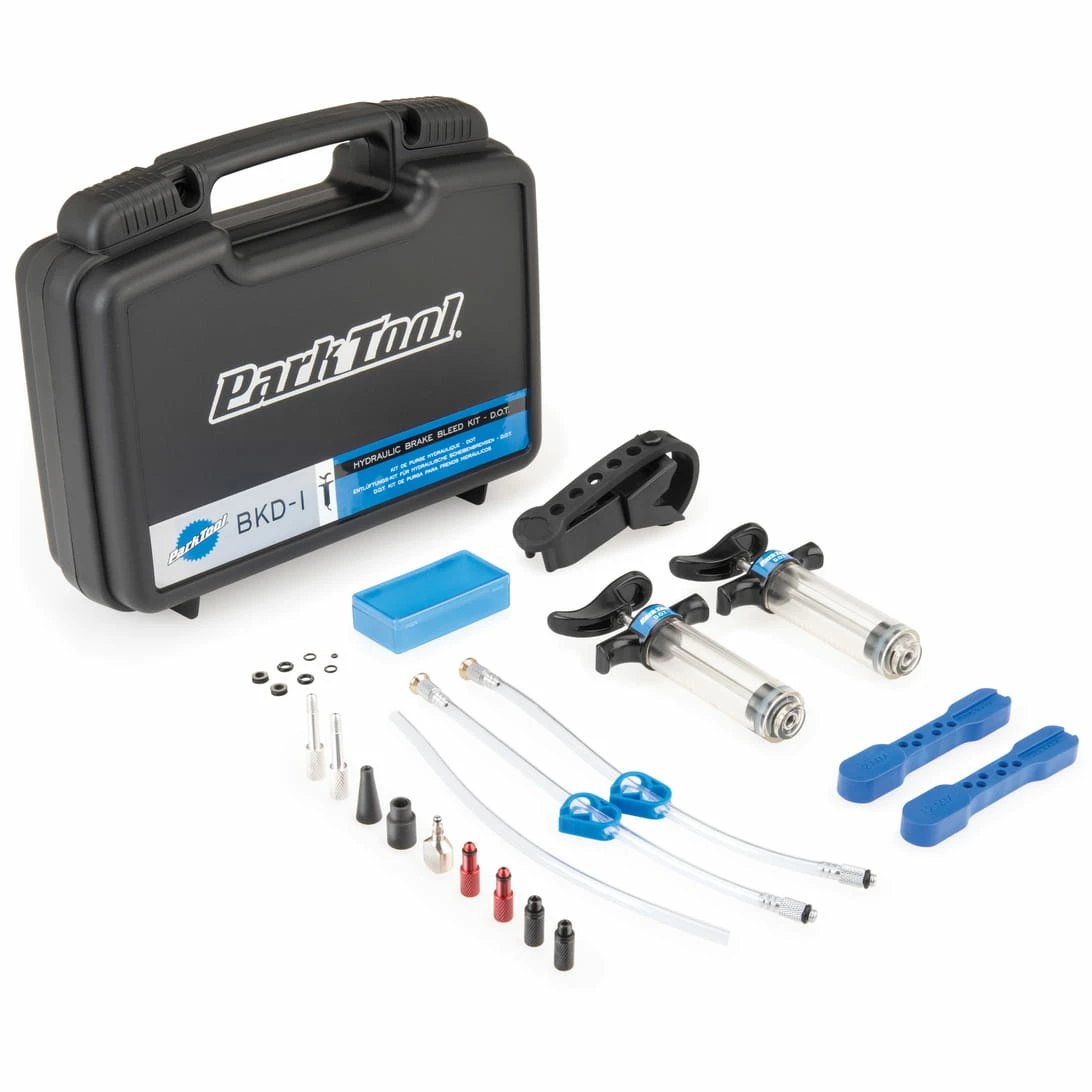 Le kit de purge de freins hydrauliques BKD-1 purge la plupart des modèles de freins hydrauliques à base de D.O.T.. Les systèmes hydrauliques doivent être purgés pour éliminer les bulles d’air et être remplis de nouveau fluide propre. Conçu et fabriqué pour les loisirs et pour les rigueurs de l’utilisation quotidienne en atelier, il comprend deux seringues, des tuyaux avec des colliers d’arrêt, des blocs de purge de différentes tailles, des entonnoirs de purge et un porte-seringue attachable unique.