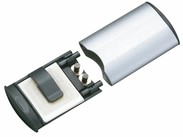 Incl. papier de verre, clip de maintien et compartiment pour un cadenas de chaîne plus 2 goupilles de chaîne.